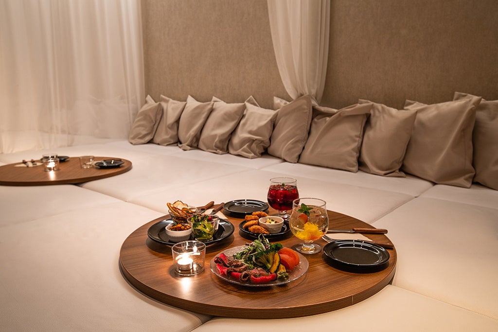 On the main floor, you can see the bustling streets of Akihabara through the glass window on one side, and the table seats with comfortable sofas and chairs are unified in white. There is a sense of playfulness in the interior, and when you go inside, the private room with raised seats and table seats separated by soft curtains create an atmosphere like a hideaway.
