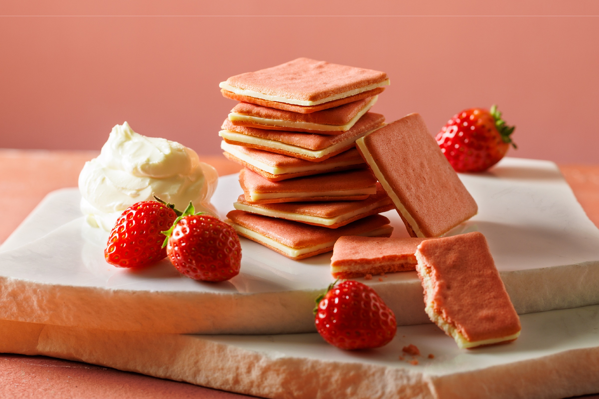 春を先取りした華やかなピンク色が目を引く、フルーティーなストロベリークッキー。ミルク感のあるやさしい甘さのマスカルポーネチーズ風味のチョコ※1をサンドして、サクサク食感に仕上げました。※チョコレートコーチングを使用(チーズ中マスカルポーネ98%使用)