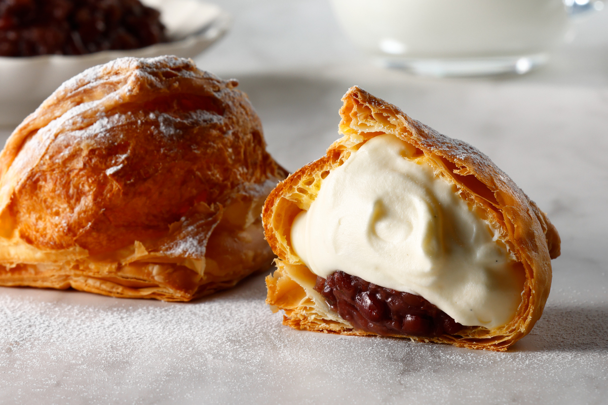 店内のオーブンで焼き上げた”サクサク”のパイに、十勝産小豆の粒あんと北海道産生乳から作られた生クリームとマスカルポーネチーズ、練乳を合わせた優しい甘さのミルククリームを閉じ込めました。